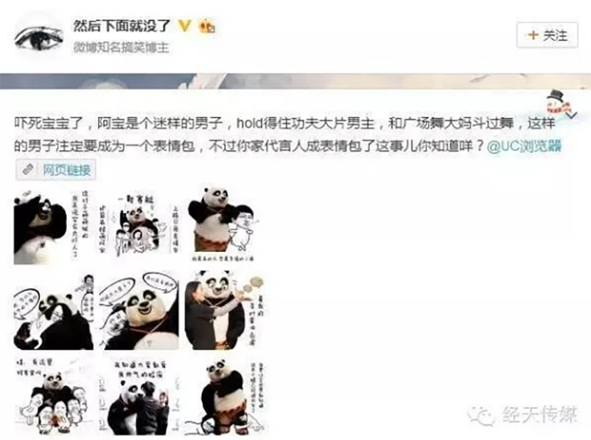 懸念揭曉之後,微博上一段“廣場舞大(dà)媽虐國(guó)寶”的視頻又迅速被網友們分(fēn)享開來(lái)。視頻中,熊貓阿寶率領UC舞團現場PK廣場舞大(dà)媽,結果落得(de)慘敗。大(dà)媽全程開挂的舞技和阿寶的魔性舞姿戳中了衆網友的笑(xiào)點,于是,各種鬼畜素材層出不窮,阿寶也被加入了豪華表情包套餐。