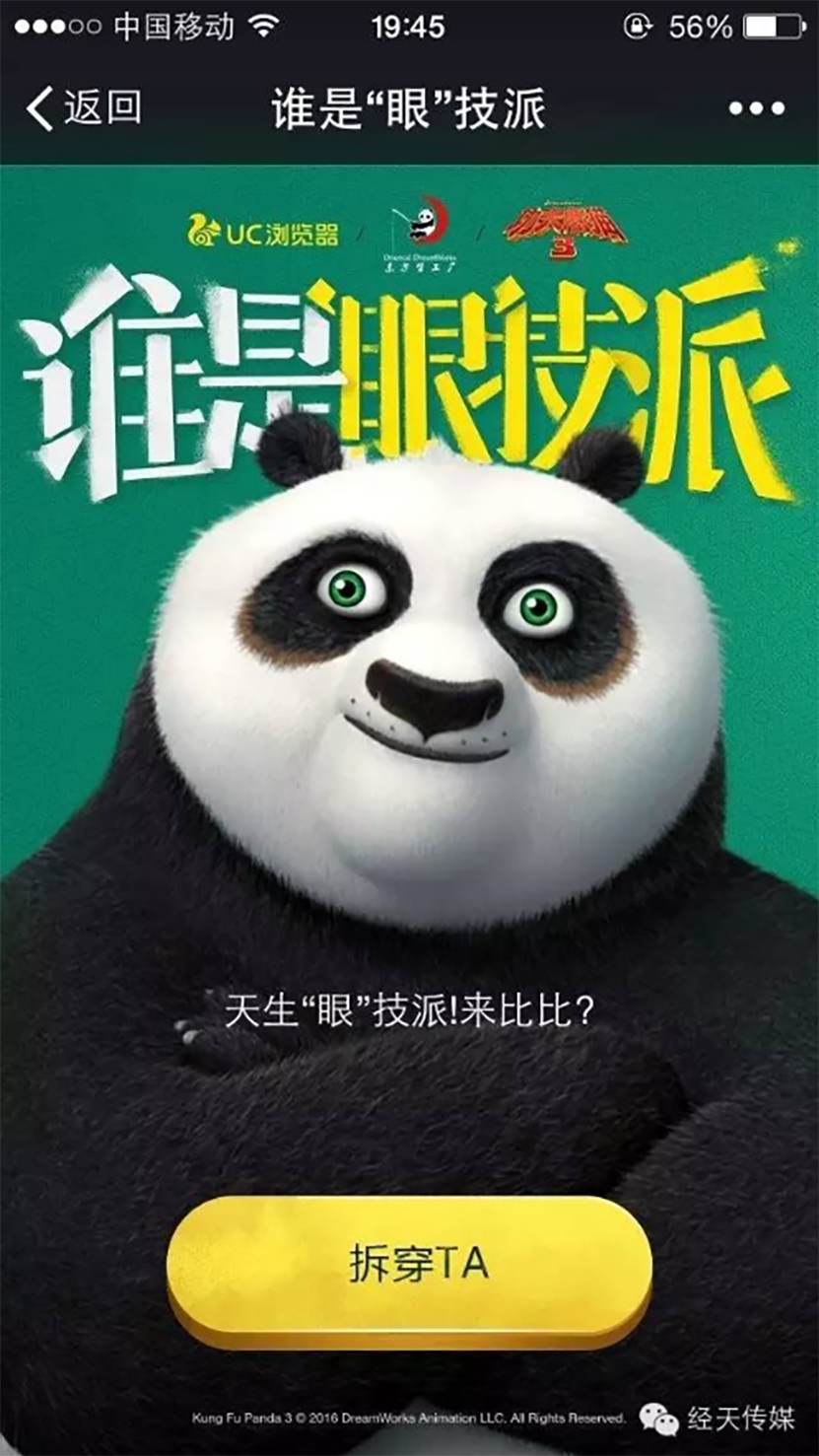 與此同時,UC官方還(hái)貼合功夫熊貓和網絡趣味“撞臉”素材,打造了一款名爲“誰是‘眼’技派”的H5小遊戲,給國(guó)内外的人(rén)氣明星、網紅(hóng)、動漫人(rén)物通通畫(huà)上了熊貓眼,以此來(lái)考驗網友們的眼力。