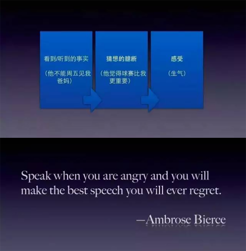 另外很多時候,人(rén)之所以生(shēng)氣都(dōu)是自(zì)己内心寫了一出戲,把自(zì)己活生(shēng)生(shēng)氣死的。在無法控制自(zì)己情緒的時候,就(jiù)倒推以下,你(nǐ)是看到了什麽,下了什麽猜測,然後才有現在的情緒和反應?