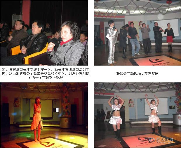 2009年(nián)1月21日(rì),離(lí)農曆牛年(nián)春節還(hái)有5 天,經天傳媒應岱山(shān)湖旅遊開發公司之邀,赴岱山(shān)湖舉行了春節聯歡晚會。在過去(qù)的一年(nián),經天傳媒和岱山(shān)湖景區的事(shì)業,都(dōu)取得(de)了跨越式發展和曆史性的突破。經天傳媒與岱山(shān)湖景區的領導、員(yuán)工(gōng),在喜悅、溫暖的氛圍中盡情聯歡,回顧一年(nián)來(lái)雙方所取得(de)的喜人(rén)成就(jiù),展望新一年(nián)的美好前景。
