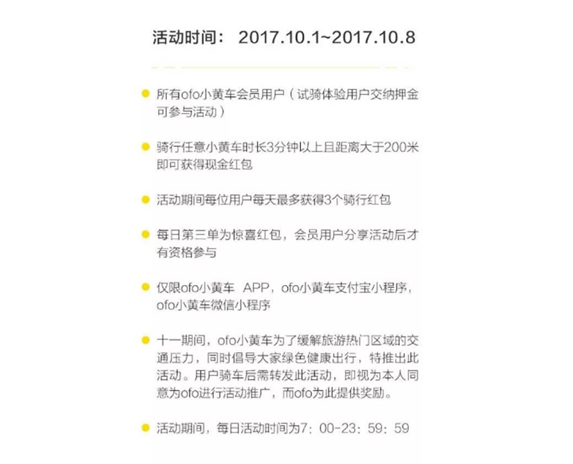 “車一動,錢就(jiù)送”,在1到8号期間用ofo APP開鎖騎小黃(huáng)車,隻要騎行夠200米或者3分(fēn)鍾,都(dōu)會有現金紅(hóng)包給到每一位用戶。