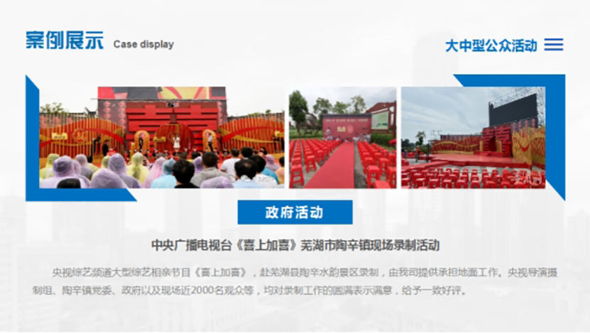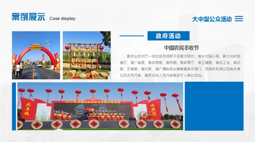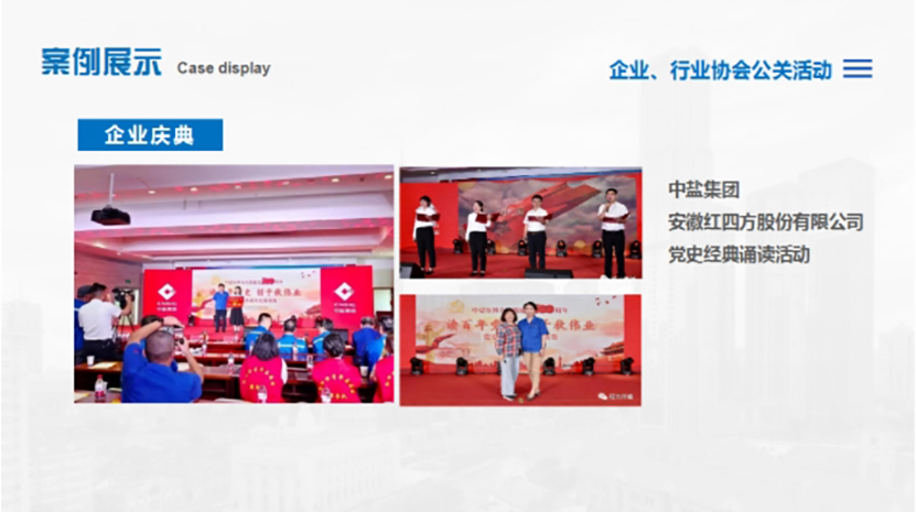 整場活動在《龍騰盛世》舞蹈中開場,由安徽廣播電視台知名主持人(rén)王天嬌、安徽遠(yuǎn)緻律師(shī)事(shì)務所創始合夥人(rén)吳飛主持。安徽遠(yuǎn)緻律師(shī)事(shì)務所主任方愛國(guó)緻歡迎詞。演繹環節有歌曲演唱、明星模仿秀、心靈魔術(shù)、經典黃(huáng)梅戲選段演唱、京劇(jù)變臉、大(dà)合唱等。中國(guó)戲劇(jù)梅花獎獲得(de)者、國(guó)家一級演員(yuán)、安徽省黃(huáng)梅戲劇(jù)院副院長、安徽省戲劇(jù)家協會副主席何雲以及安徽省廣播電視台知名主持人(rén)大(dà)胡、安徽知名青年(nián)歌手朱衡梓受邀現場助興。節目形式多樣,内容豐富,精彩紛呈,整個慶典的氣氛高潮叠起,掌聲不斷